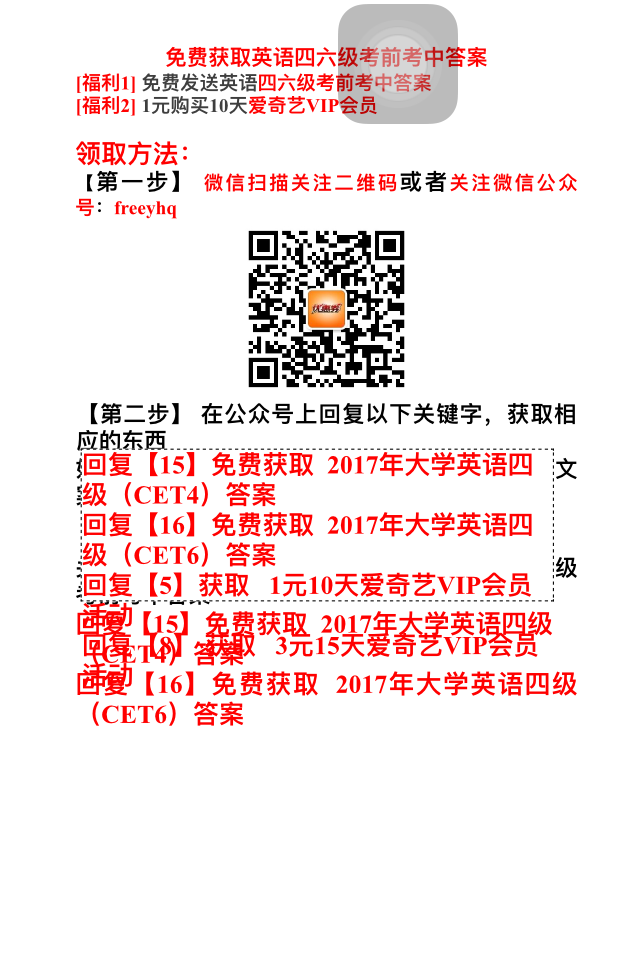 首先微信关注公众号:freeyhp,然后在公众号上回复以下关键字,获取相应的东西:回复【15】免费获取2017年大学英语四级答案;回复【16】免费获取2017年大学英语六级答案;回复【5】获取1元10天爱奇艺VIP会员;回复【8】获取3元15天爱奇艺VIP会员